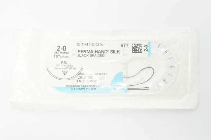 - Ethicon 677 2-0 PERMA-HAND SILK, FSL 30mm 3/8c Reverse Cutting, 18inch (x)