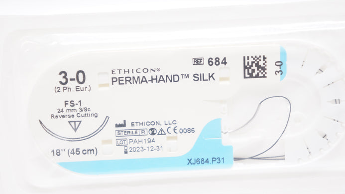 - Ethicon 684 3-0 Perma-Hand Silk FS-1 24mm 3/8c Reverse Cutting, 18inch