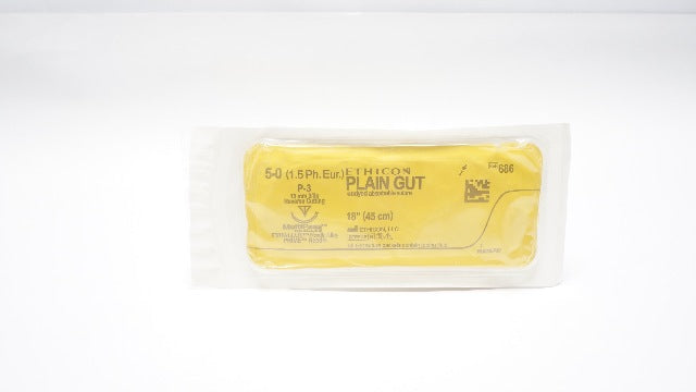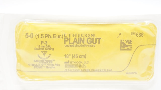 - Ethicon 686 5-0 Plain Gut, P-3, 13mm 3/8c Reverse Cutting, 18inch