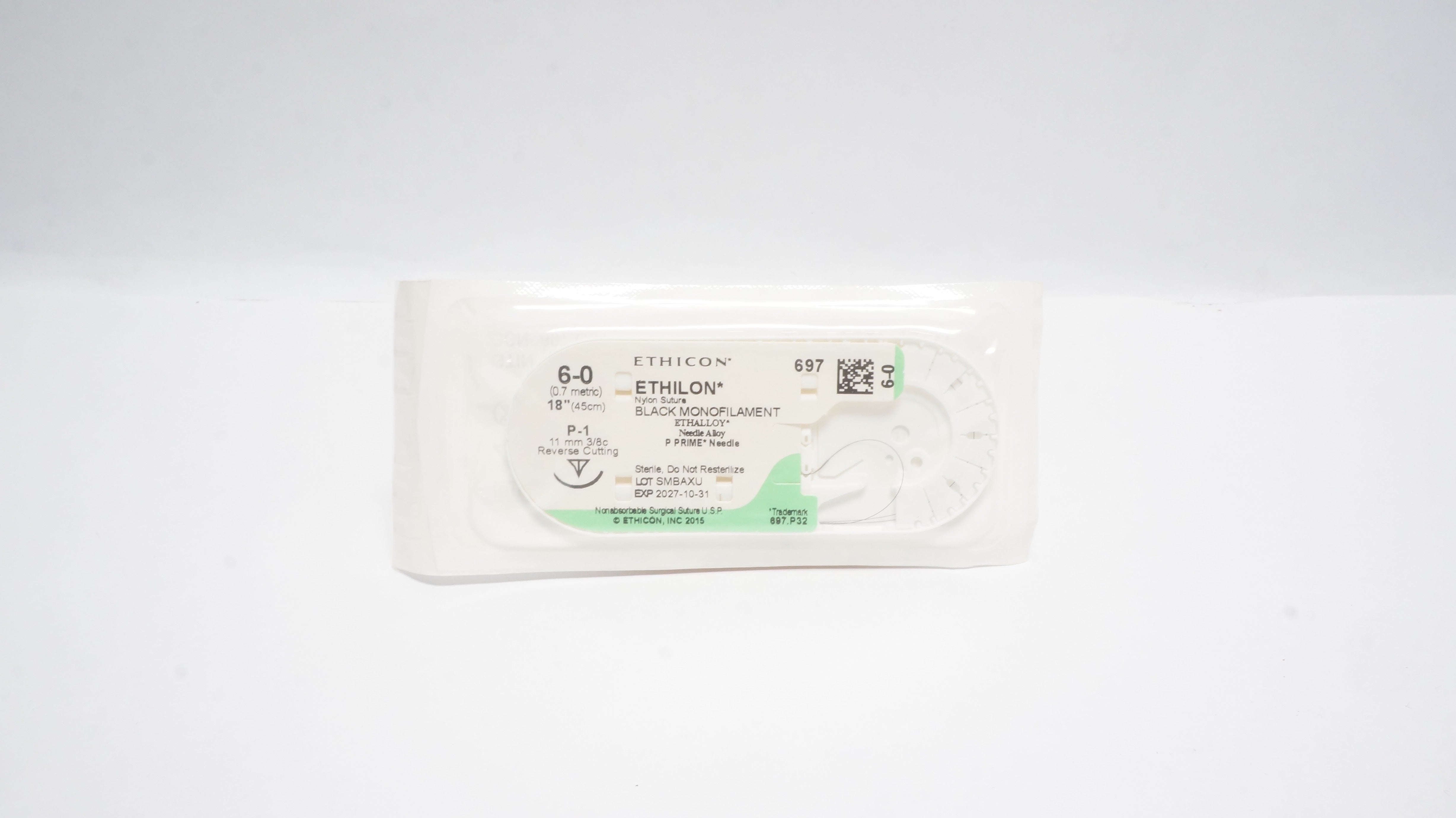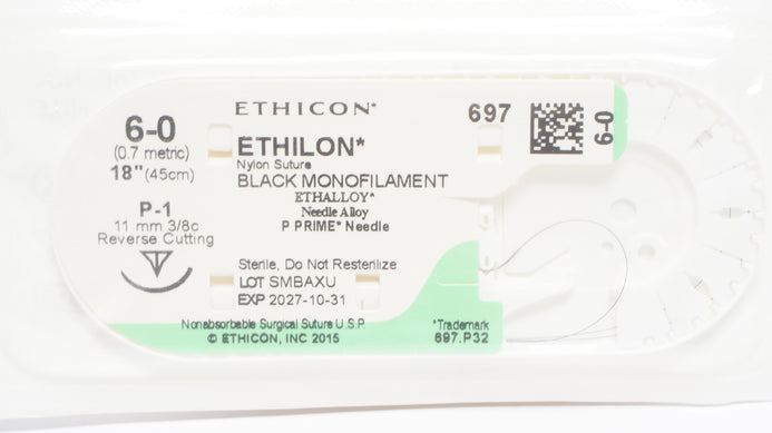 Ethicon 697 6-0 Ethilon Nylon Stre P-1 11mm 3/8c Reverse Cutting 18inch