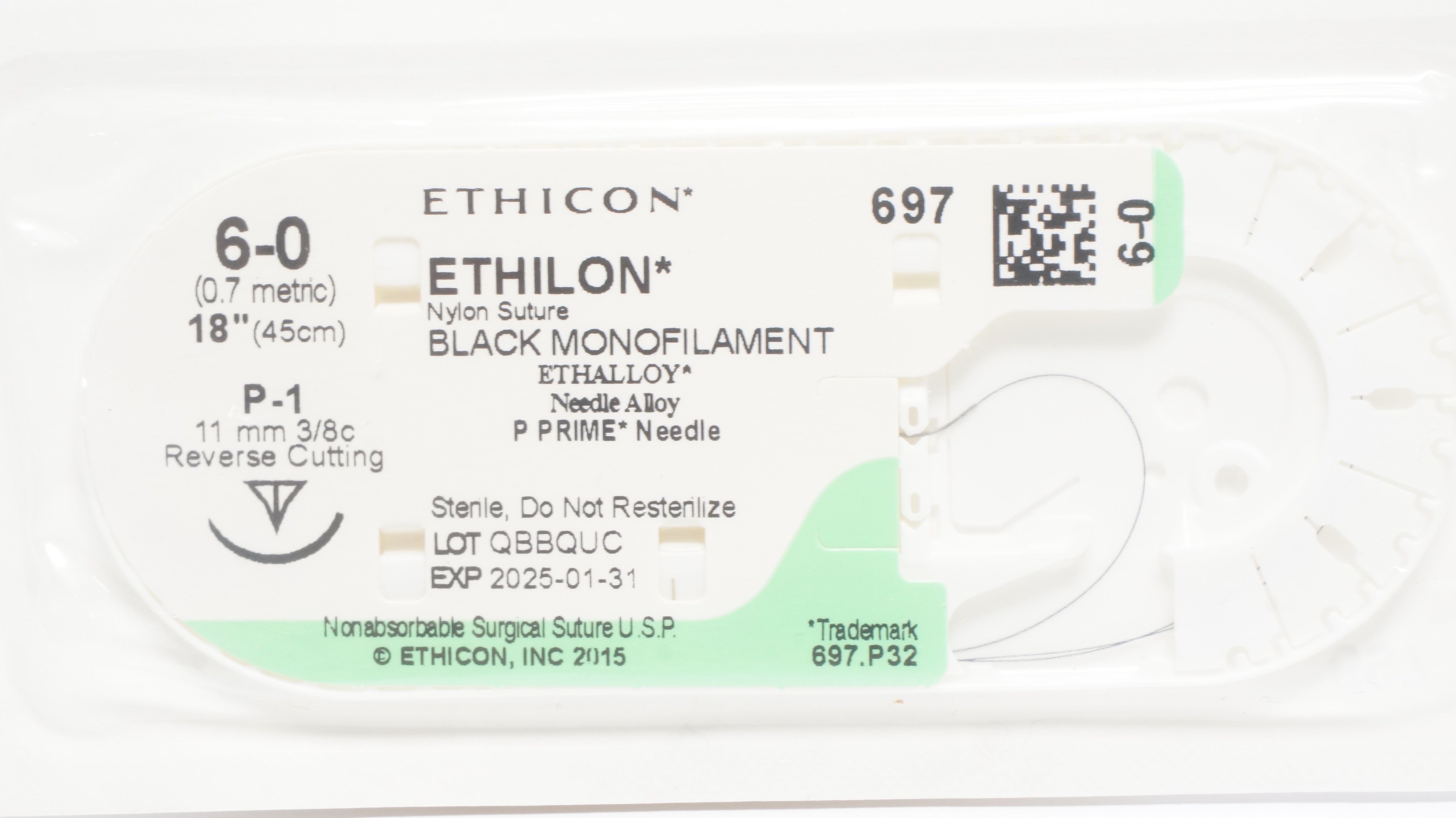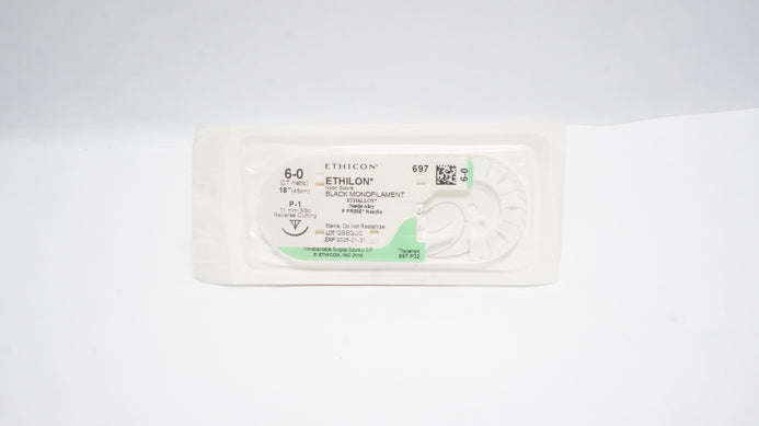 Ethicon 697 6-0 Ethilon Nylon Suture Black Monofilament P-1 11mm 3/8c Reverse Cutting 18inch