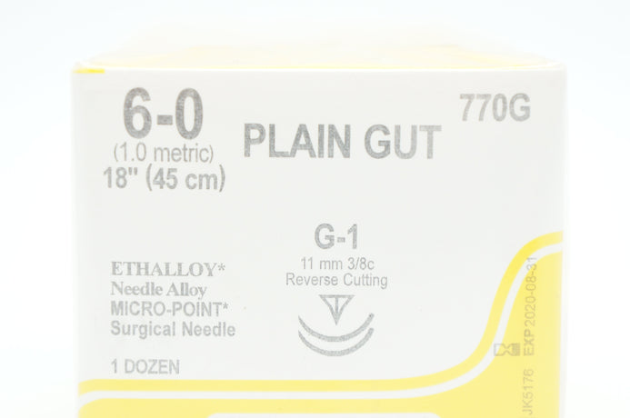 Ethicon 770G 6-0 Plain Gut G-1 11mm 3/8c Reverse Cutting 18inch (x) - Box of 12