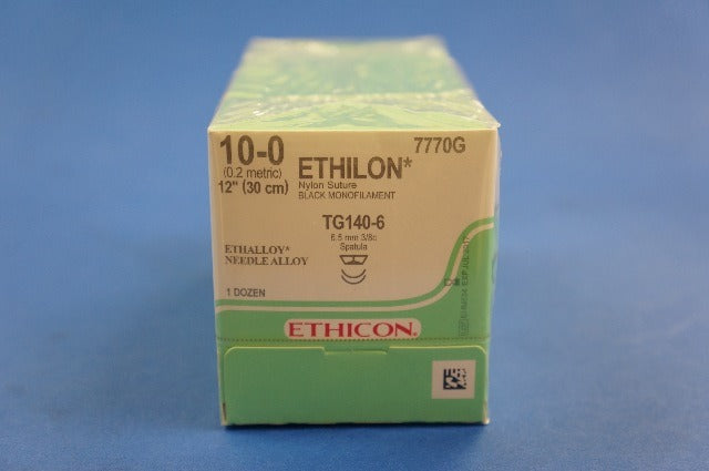 Ethicon 7770G ETHILON Suture, MICROPOINT - Spatula, Non-Absorbable, TG140-6 6.5mm / TG140-6 3/8 Circle, Black Monofilament 12" ˜ 30cm, Size: 10-0, Qty: 12/box