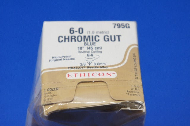 Ethicon 795G Chromic Gut, MICROPOINT-Reverse Cutting, Absorbable, G-6, Blue Chromic Monofilament 18" 45cm, Size 6-0