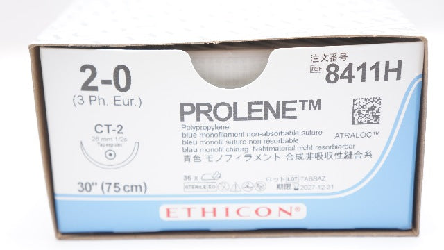 Ethicon 8411H 2-0 Prolene Stre CT-2 26mm 1/2c Taperpoint 30inch - Box of 36