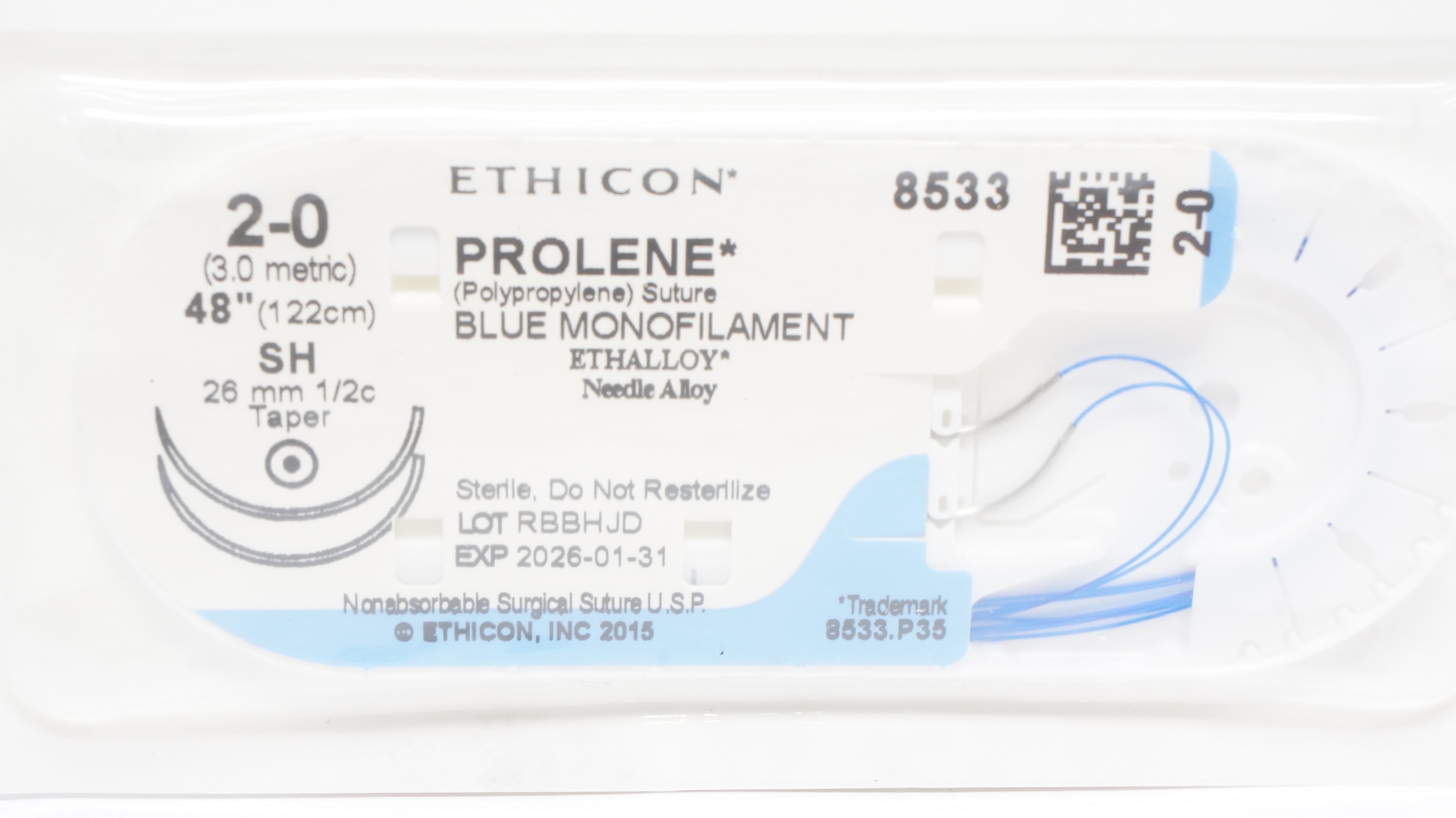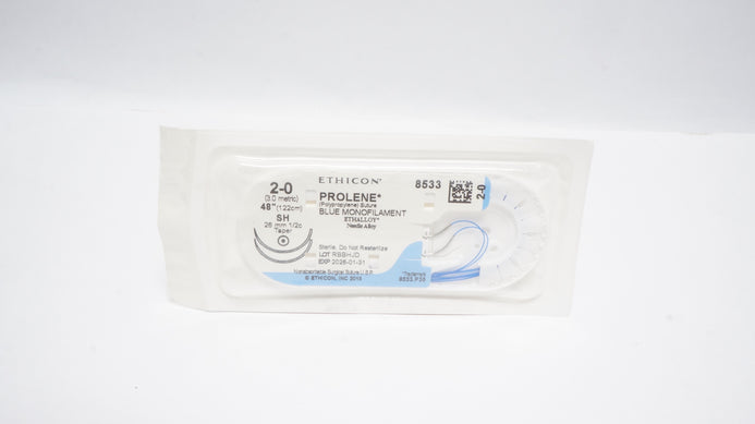- Ethicon 8533 2-0 PROLENE Polypropylene Stre SH, 26mm 1/2c Taper, 48inch