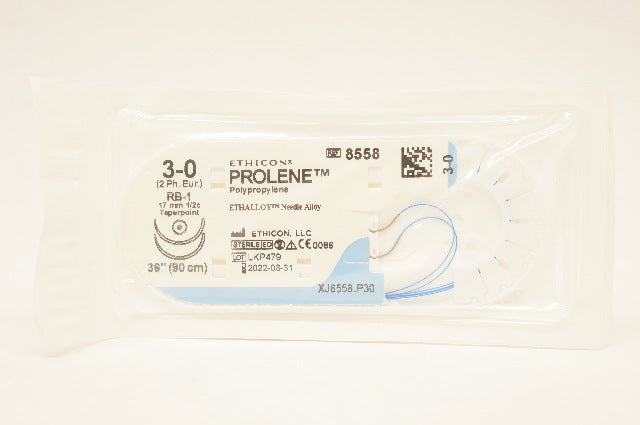 Ethicon 8558 3-0 PROLENE Polypropylene Blue Monofilament Suture RB-1 17mm 1/2c Taperpoint, 36inch