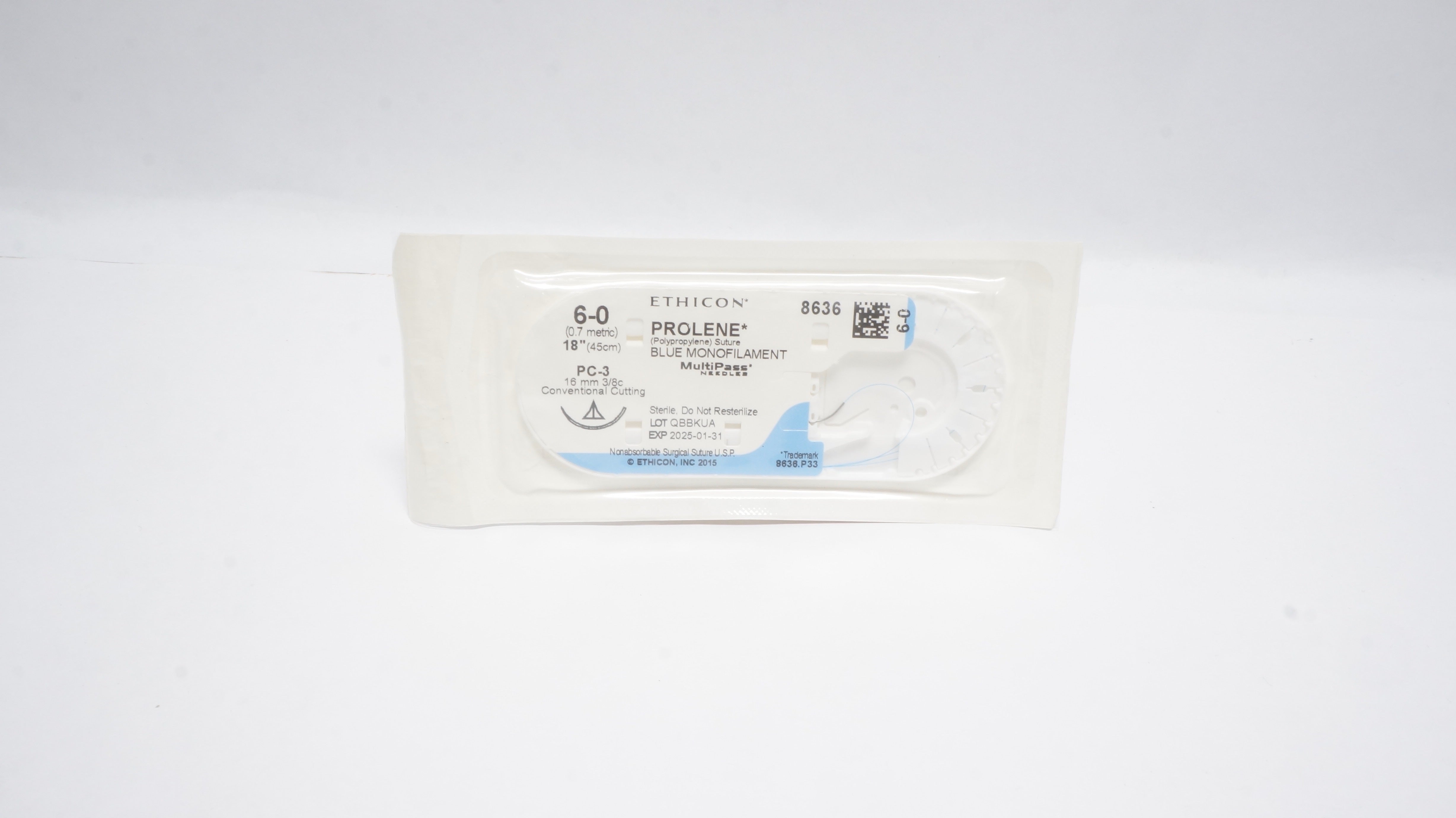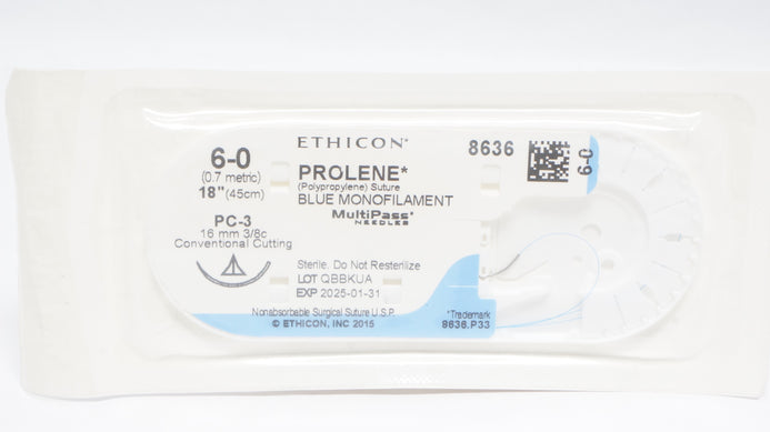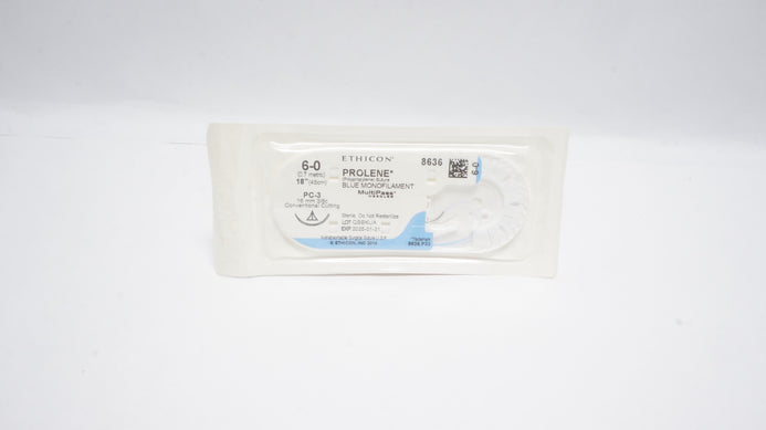 Ethicon 8636 6-0 PROLENE Polypropylene Suture Blue Monofilament PC-3 16mm 3/8c Conventional Cutting 18inch