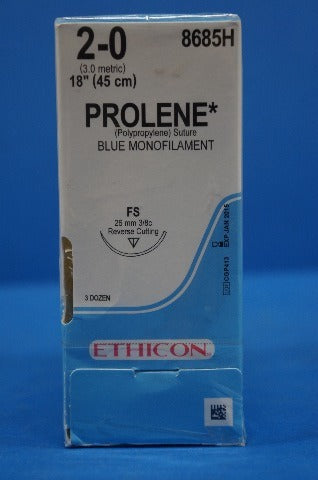 Ethicon 8685H PROLENE Suture, Reverse Cutting, Non-Absorbable, FS 26mm 3/8 Circle, Blue Monofilament 18" 45cm, Size: 2-0
