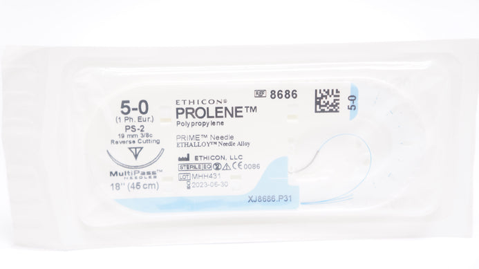 - Ethicon 8686 5-0 PROLENE PS-2, 19mm 3/8c Reverse Cutting, 18in (x)