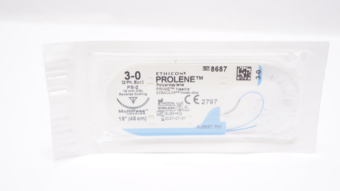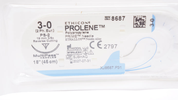 Ethicon 8687 3-0 PROLENE PolypropyleneStre PS-2 19mm 3/8c Reverse Cutting 18inch