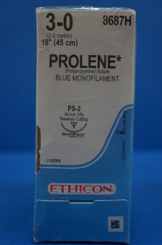Ethicon 8687H PROLENE, Precision Point - Reverse Cutting, Non-Absorbable, PS-2 19mm 3/8 Circle, Blue Monofilament 18" 45cm, Size: 3-0