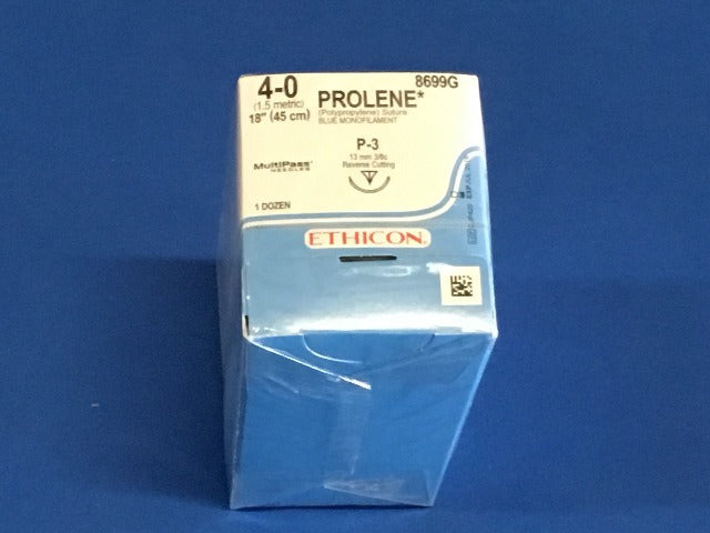 Ethicon 8699G PROLENE, Precision Point - Reverse Cutting, Non-Absorbable, P-3 13mm 3/8 Circle, Blue Monofilament 18" 45cm, Size: 4-0