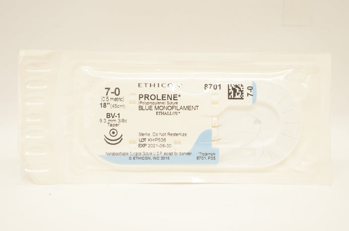 Ethicon 8701 7-0 PROLENE, BV-1 Blue Monofilament 9.3mm 3/8c Taper, 18inch