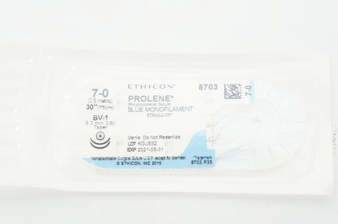 Ethicon 8703 7-0 PROLENE Polypropylene Stre Blue Monofilament BV-1, 9.3mm 3/8c Taper, 30inch