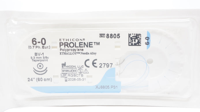 - Ethicon 8805 6-0 PROLENE Polypropylene Stre BV-1 9.3mm 3/8c Taperpoint, 24 inch