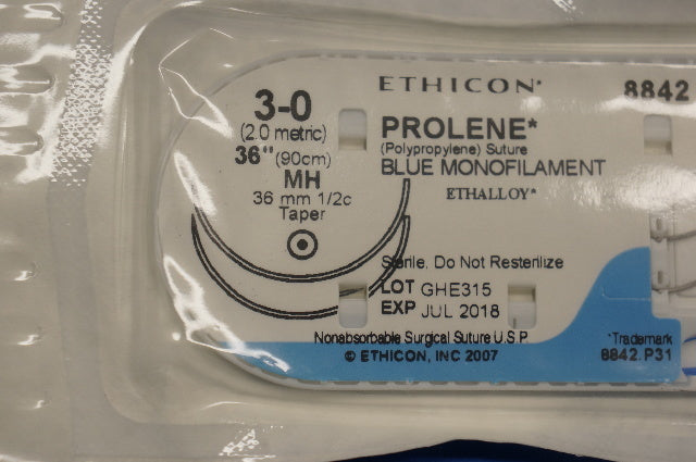 Ethicon 8842 3-0 PROLENE, MH 36mm 1/2c Taper, Blue Monofilament, 36