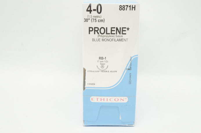 - Ethicon 8871H 4-0 Prolene 30in Blue Monofilament RB-1 17mm 1/2c Tap-Box of 36(x)