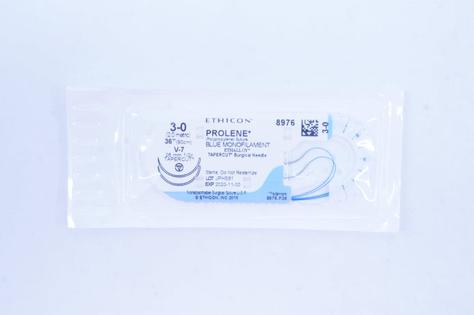 Ethicon 8976 3-0 Prolene (Polypropylene) Suture Blue Monofilament Ethalloy Tapercut Surgical Needle V-7 26mm 1/2c Tapercut 36 inch