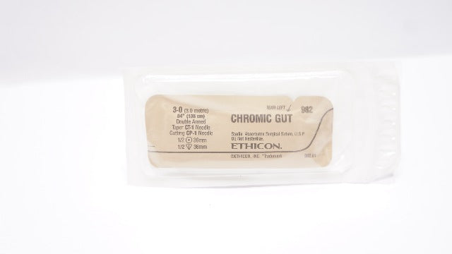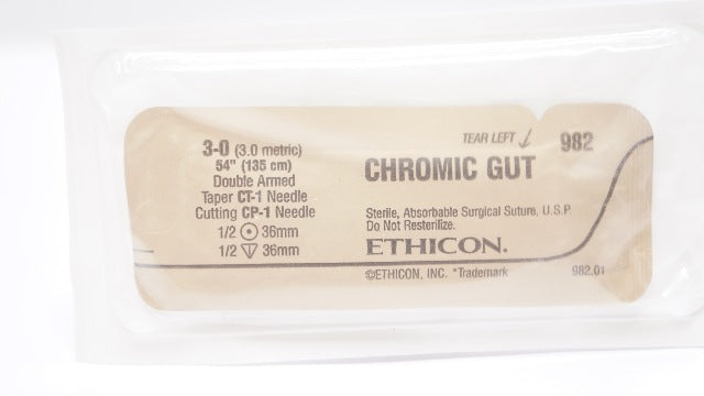 Ethicon 982 3-0 CHROMIC GUT, Double Armed, Taper 1/2 36mm CT-1 Needle and 1/2 36mm Cutting CP-1 Needle, 54inch