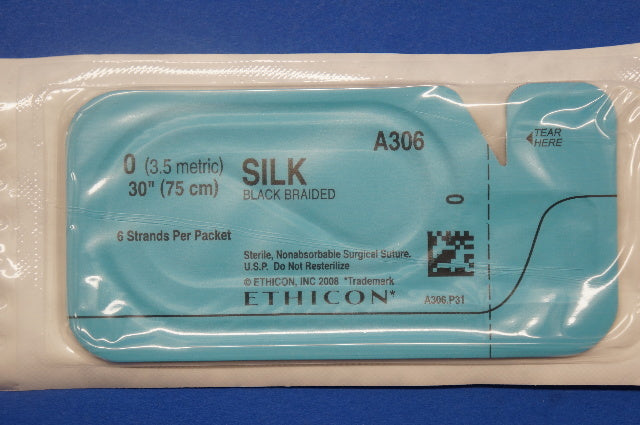 Ethicon A306 0 SILK, Black Braided, 30", 6 Strands Per Packet