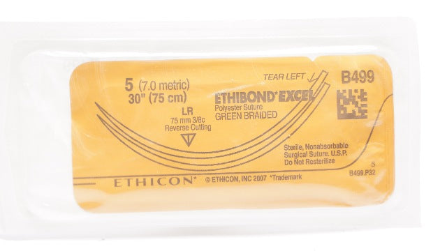 - Ethicon B499 5 Ethibond Excel, LR, 75mm 3/8c Reverse Cutting, 30inch