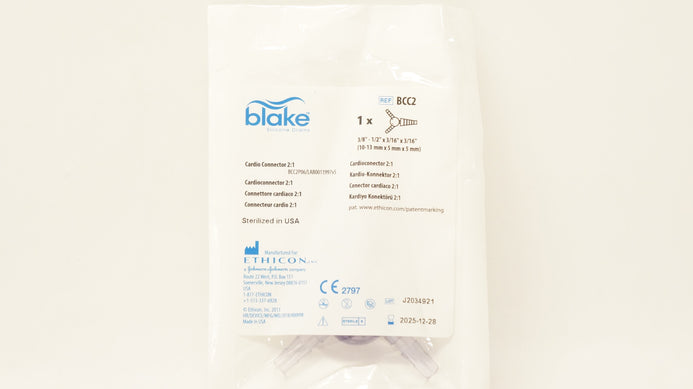 - Ethicon BCC2 Blake Silicone Drains Cardio Connector 2:1 3/8-1/2in x3/16inx3/16in