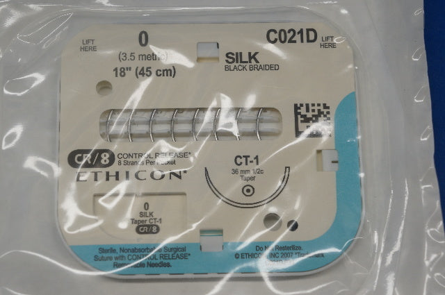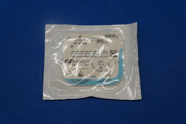 Ethicon C021D SILK, CT-1 36mm 1/2c Taper, Black Braided, 18", Size 0