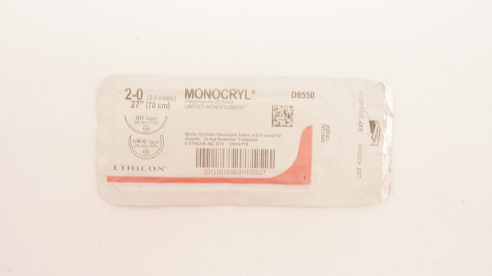 - Ethicon D8550 2-0 MONOCRYL Stre SH 26mm 1/2c, UR-6 26mm 5/8c, 27inch (x)