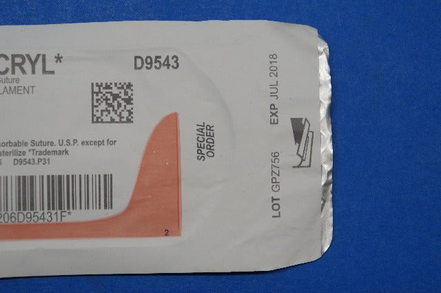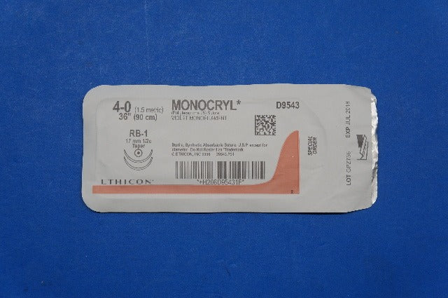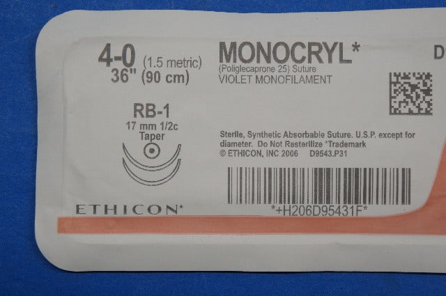 - Ethicon D9543 4-0 MONOCRYL, RB-1 17mm 1/2c Taper, Violet Monofilament, 36inch
