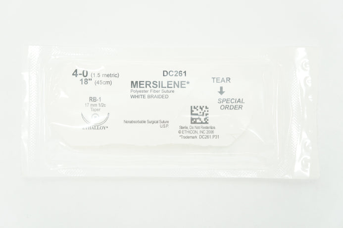Ethicon DC261 Mersilene Polyester Fiber Suture White Braided 4-0 18in RB-1 Taper 17mm 1/2c
