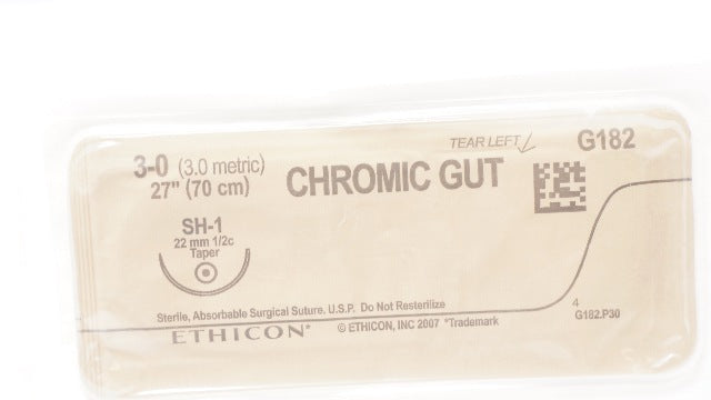 - Ethicon G182 3-0 CHROMIC GUT, SH-1, 22mm 1/2c Taper, 27inch (x)