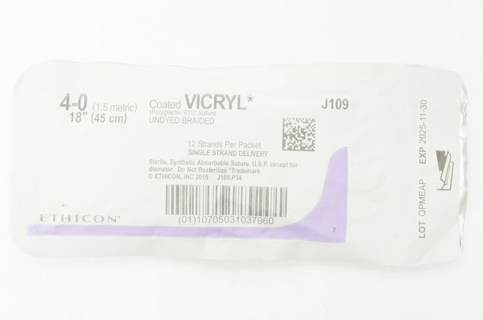 - Ethicon J109 4-0 Coated VICRYL Polyglactin 910 Suture Undyed Braided 18inch