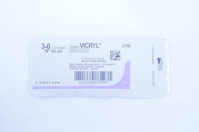 Ethicon J110 3-0 Coated VICRYL (Polyglactin 910) Suture Undyed Braided, 18 inch 12 Strands Per Packet