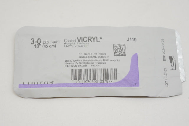 - Ethicon J110 3-0 VICRYL, Undyed Braided, 18inch