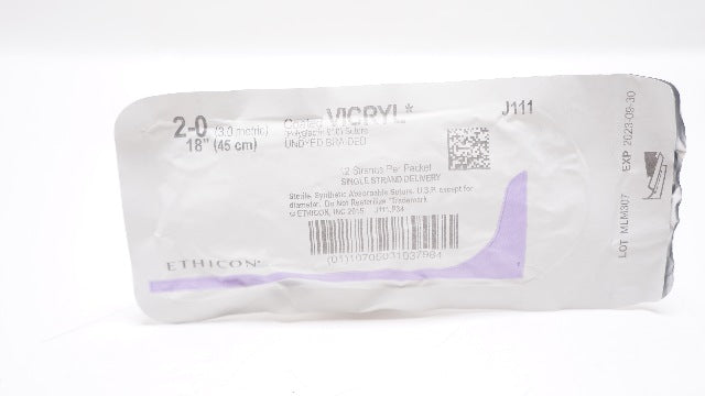 Ethicon J111 2-0 Coated VICRYL (Polyglactin 910) Suture Undyed Braided 12 Strands Per Packet, 18 inch