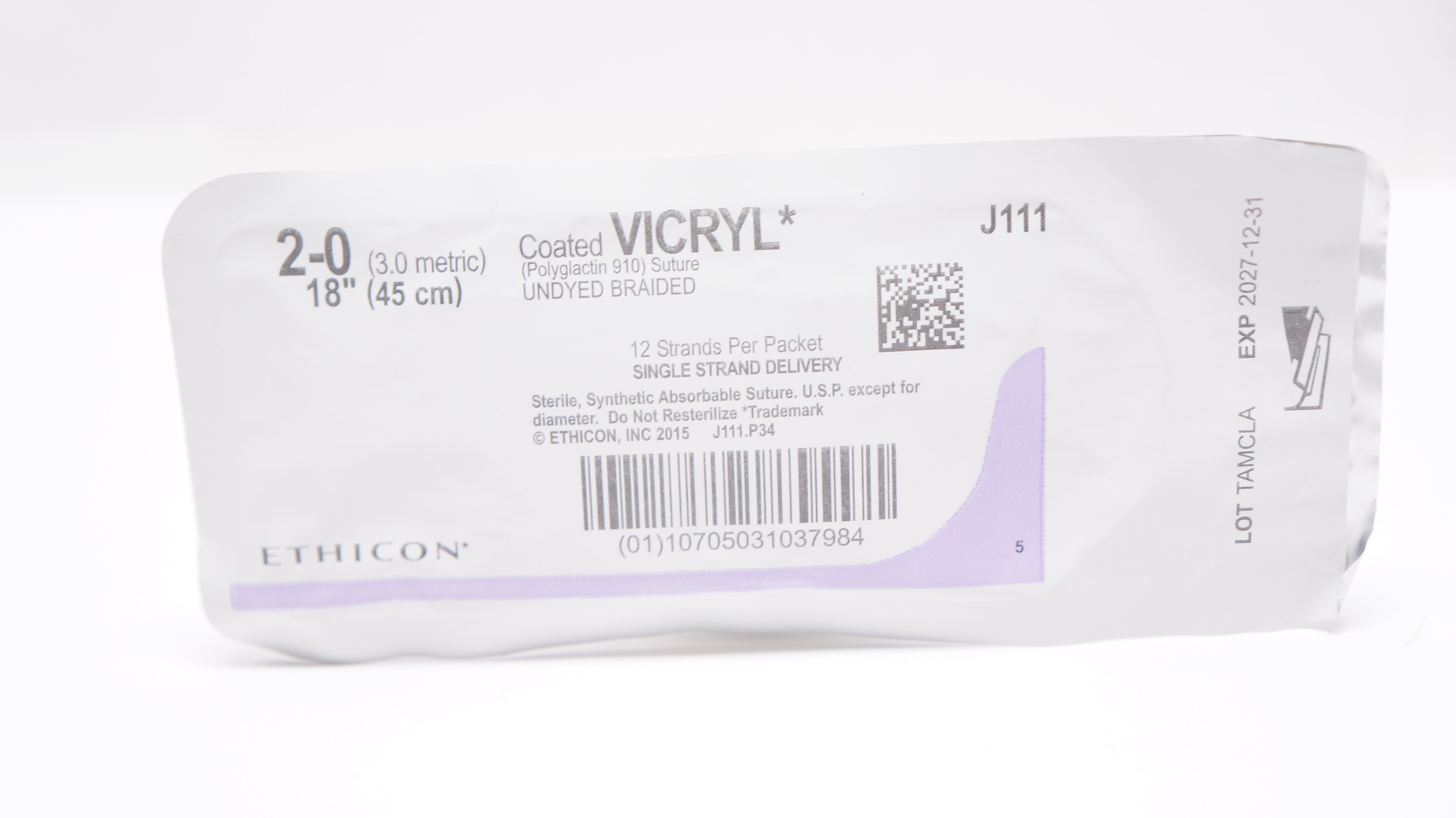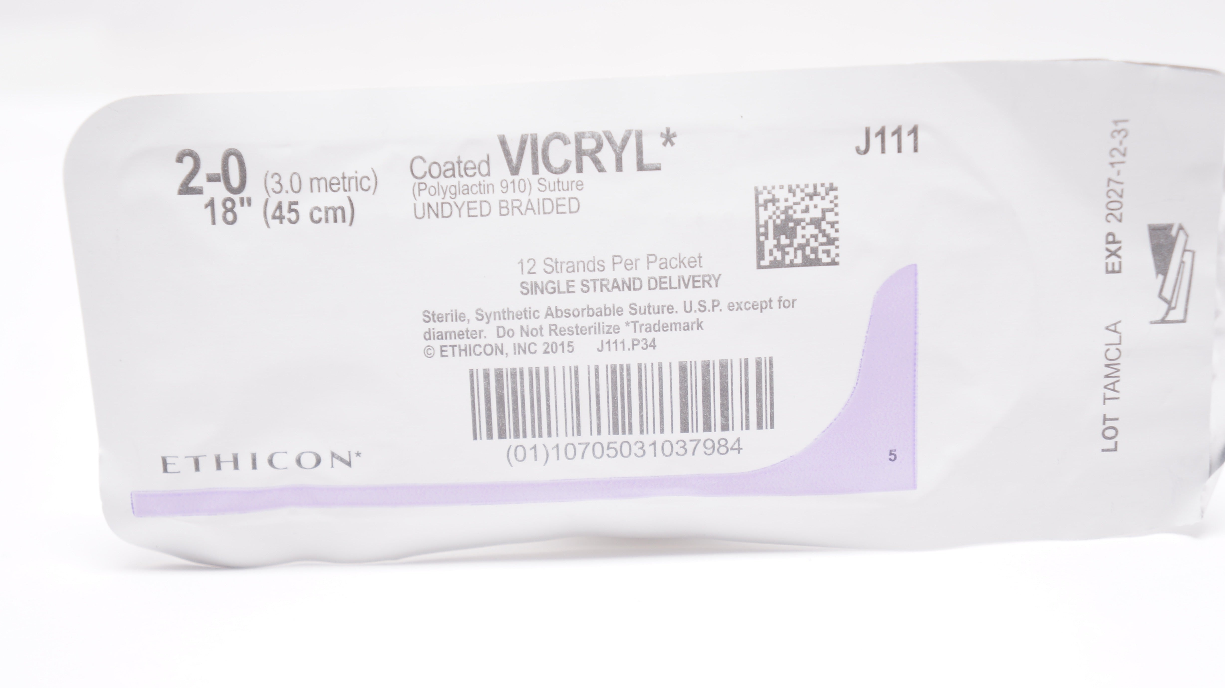 - Ethicon J111 2-0 Coated VICRYL (Polyglactin 910) Stre Undyed Braided, 18inch
