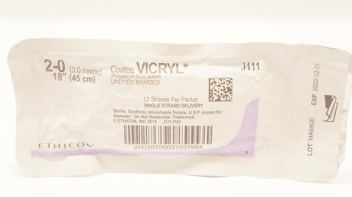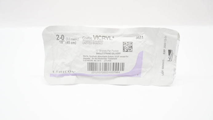 - Ethicon J111 2-0 Coated VICRYL Polyglactin 910 Undyed Braided 18inch (x)