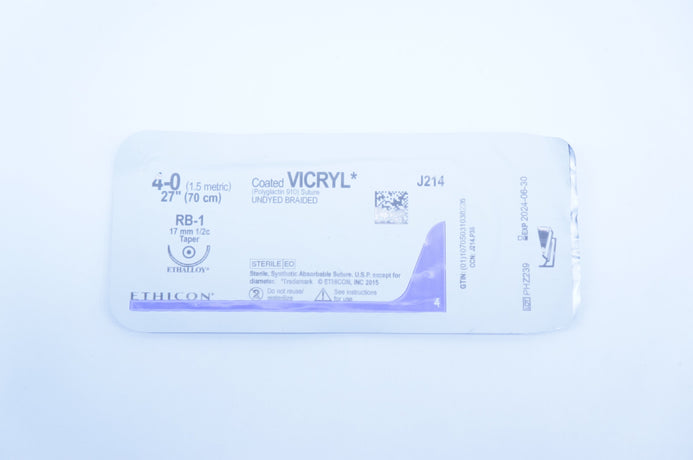 - Ethicon J214 4-0 Vicryl Stre. Undyed Braided, RB-1 17mm Tapper, 27in