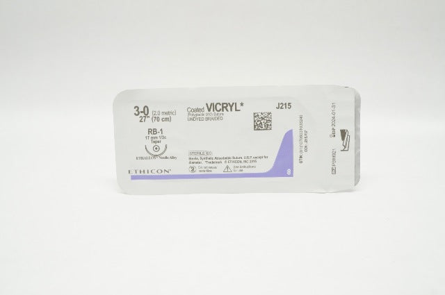 Ethicon J215 3-0 Coated VICRYL Polyglactin Stre RB-1 17mm 1/2c Taper 27inch (x)