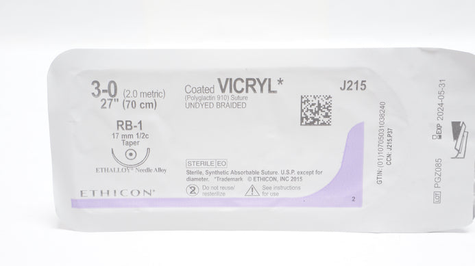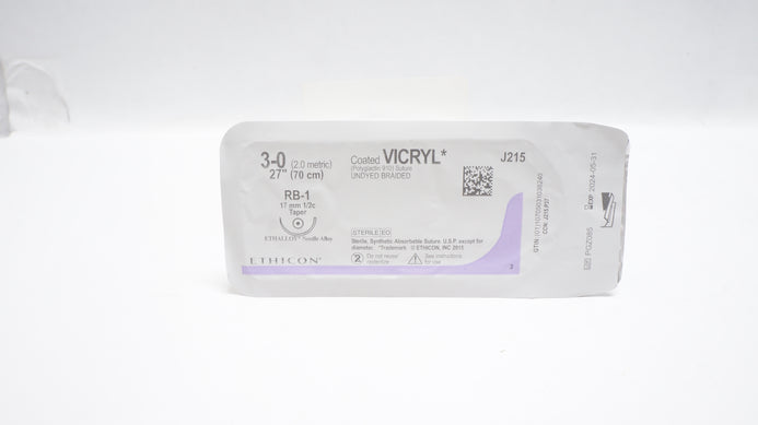 - Ethicon J215 3-0 Coated VICRYL Polyglactin Stre RB-1 17mm 1/2c Taper, 27inch (x)