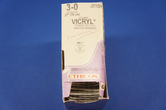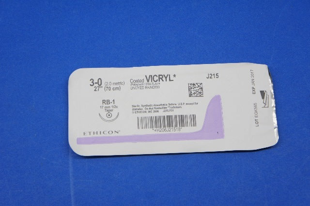 Ethicon J215H Coated VICRYL, Taper Point, Absorbable, RB-1 17mm ½ Circle, Undyed Braided 27" 70cm, Size: 3-0