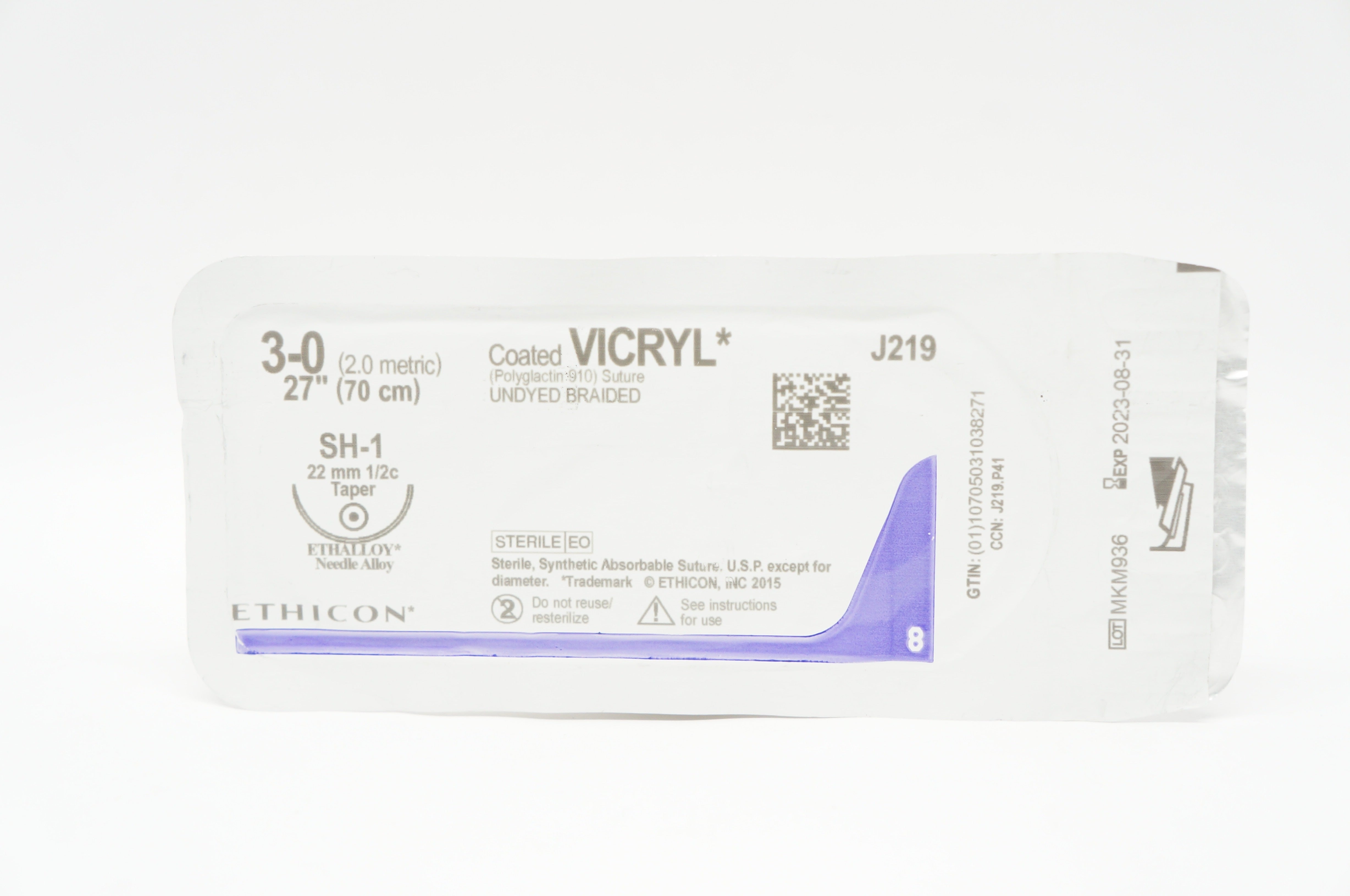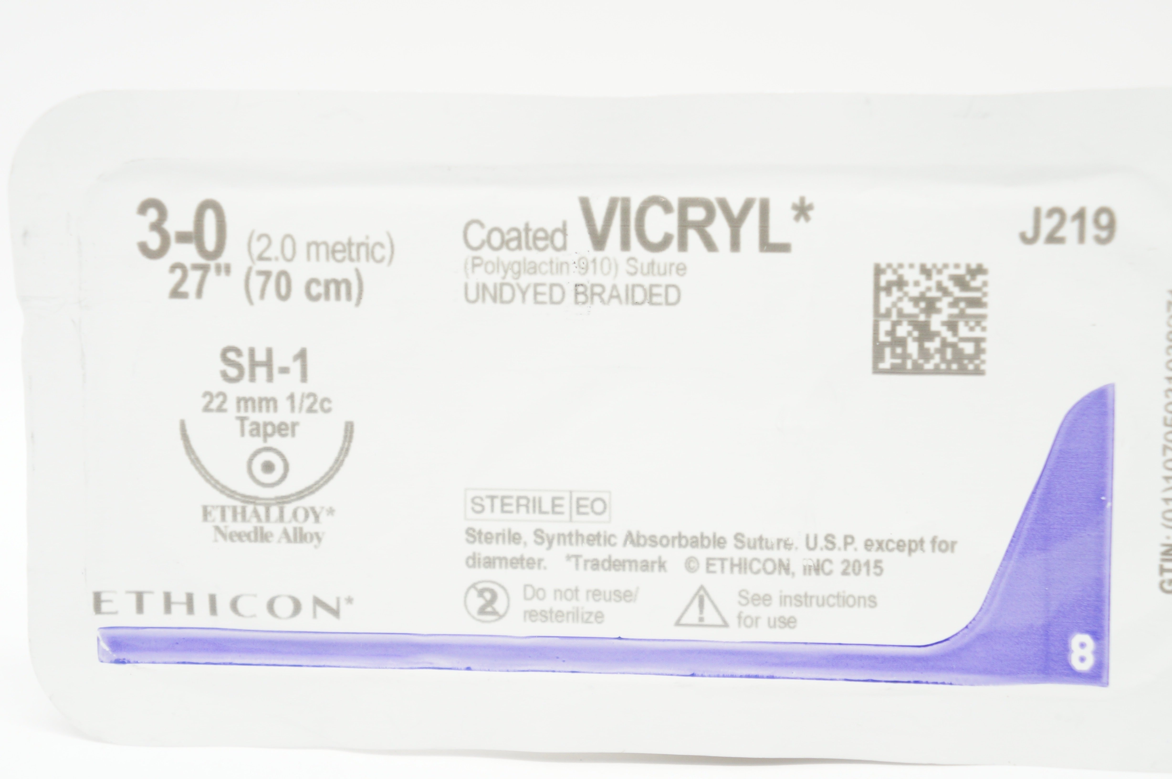 - Ethicon J219 3-0 Coated Vicryl SH-1, 22mm 1/2c Taper, 27inch