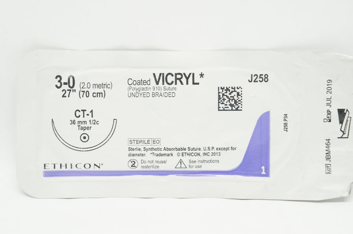 - Ethicon J258 3-0 Coated VICRYL Stre CT-1 36mm 1/2c Taper, 27inch (x)