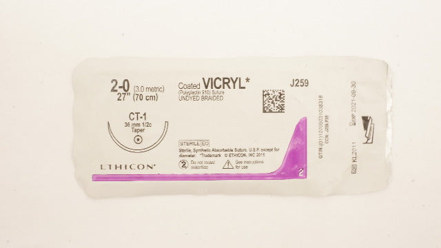 Ethicon J259 2-0 Coated VICRYL Polyglactin 910 Suture Undyed Braided CT-1 36mm 1/2c Taper, 27inch