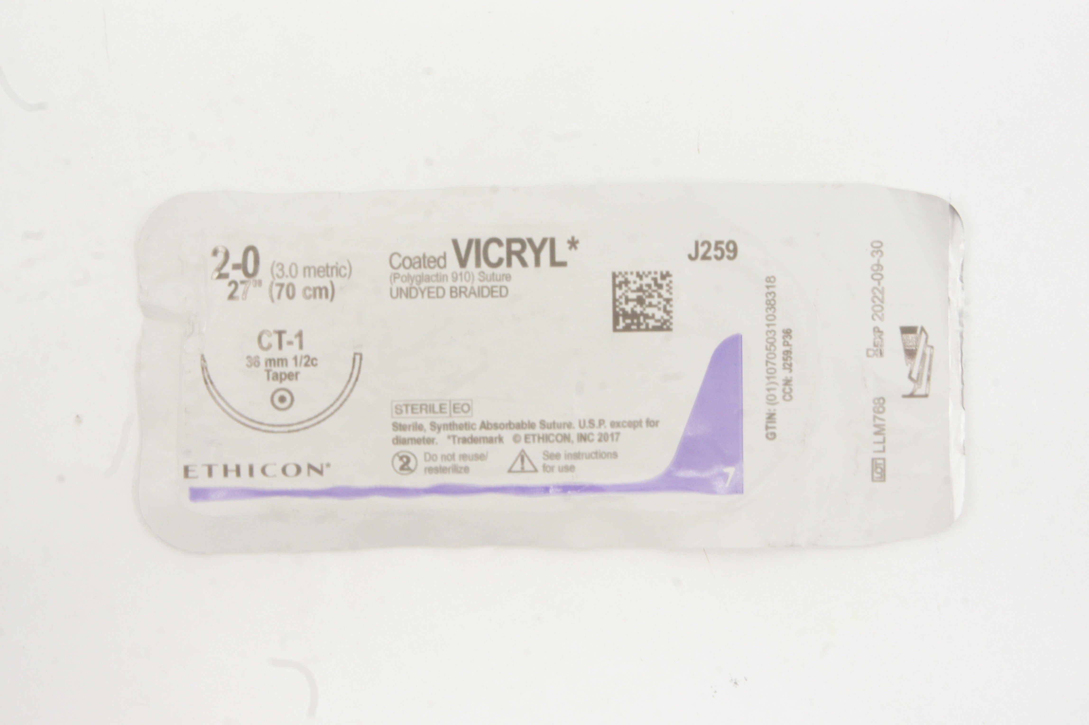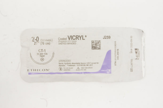 - Ethicon J259 2-0 Coated VICRYL Stre CT-1 36mm 1/2c Taper, 27inch (x)