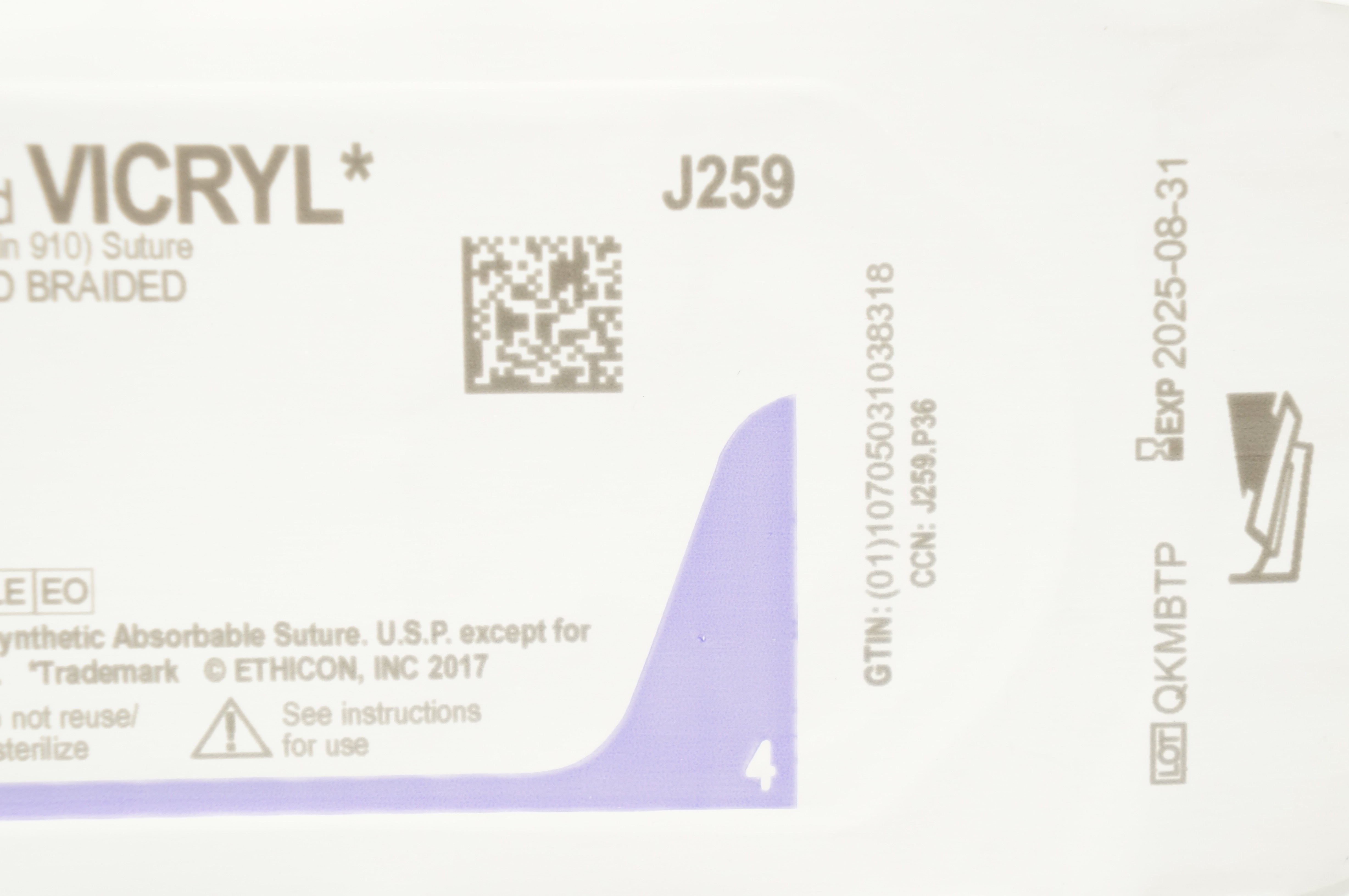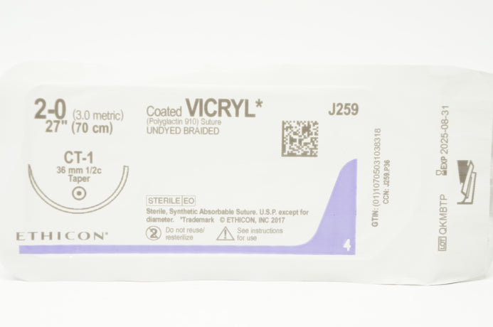 Ethicon J259 2-0 Coated VICRYL Polyglactin 910 Undyed Braided Suture CT-1 36mm 1/2c Taperpoint, 27 inch