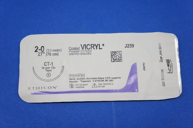 Ethicon J259H VICRYL, Taper Point, Absorbable, CT-1 36mm, Undyed Braided 27" 70cm, Size: 2-0