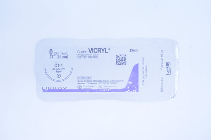 Ethicon J260 0 Coated VICRYL (Polyglactin 910) Suture, Undyed Braided, CT-1, 36mm 1/2c Taper 27 inch