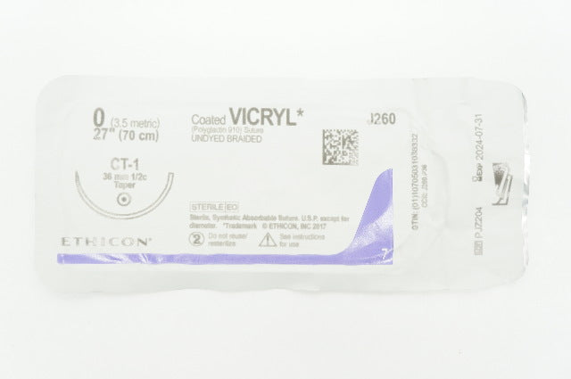 - Ethicon J260 0 VICRYL Undyed Braided, CT-1 36mm 1/2c Taper 27 inch